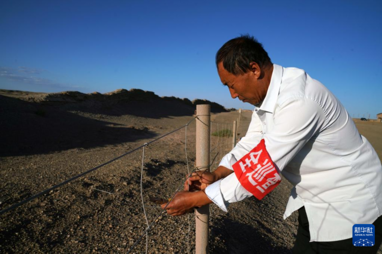 7月16日,张吉全沿着汉长城巡护时加固防护栏。
