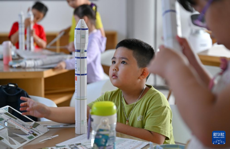 7月18日,小朋友在制作火箭模型。