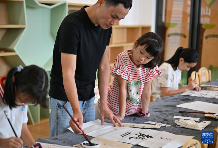 7月18日,老师在教小朋友书法。
