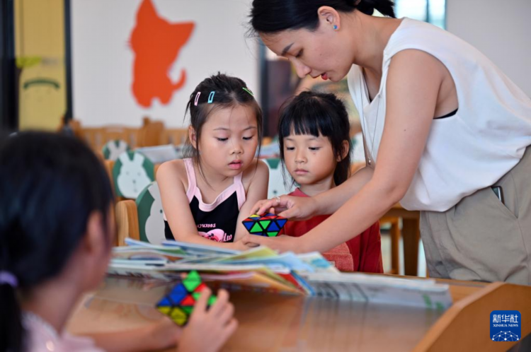 7月18日,小朋友在学习魔方。