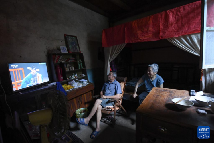 7月17日,在松阳县松庄村,村民叶高水、叶明秀在家中看黄梅戏。