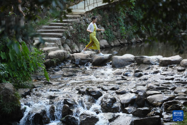 7月17日,在松阳县松庄村,一名游客走过村里的碇步桥。