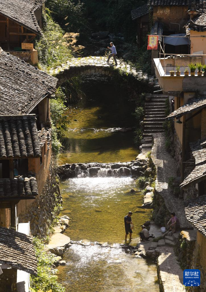 7月18日清晨,在松阳县松庄村,村民在溪涧中浣洗。