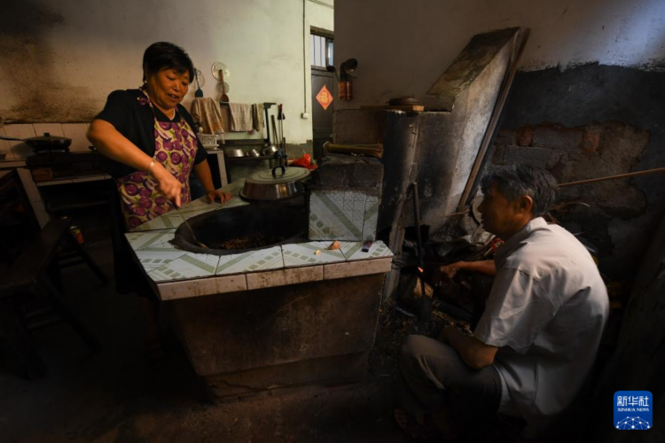 7月17日,在松阳县松庄村,村民李文生(右)、宋水秀用土灶做晚饭。