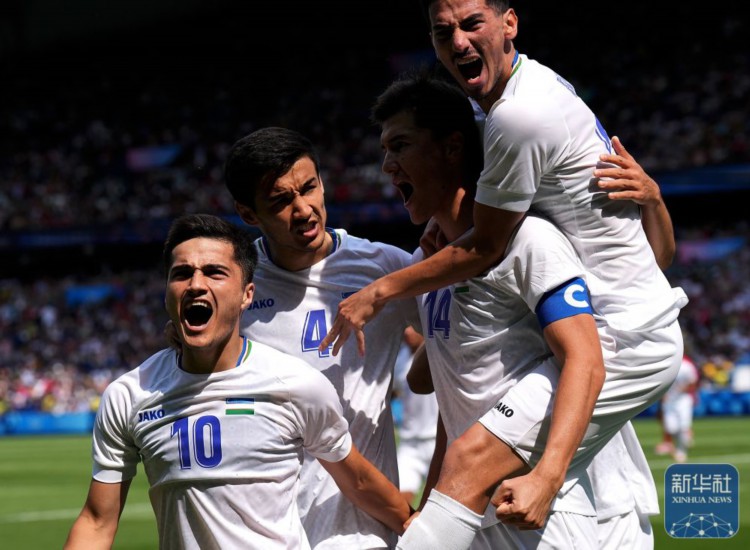 乌兹别克斯坦队球员在比赛中庆祝进球。新华社记者 李一博 摄