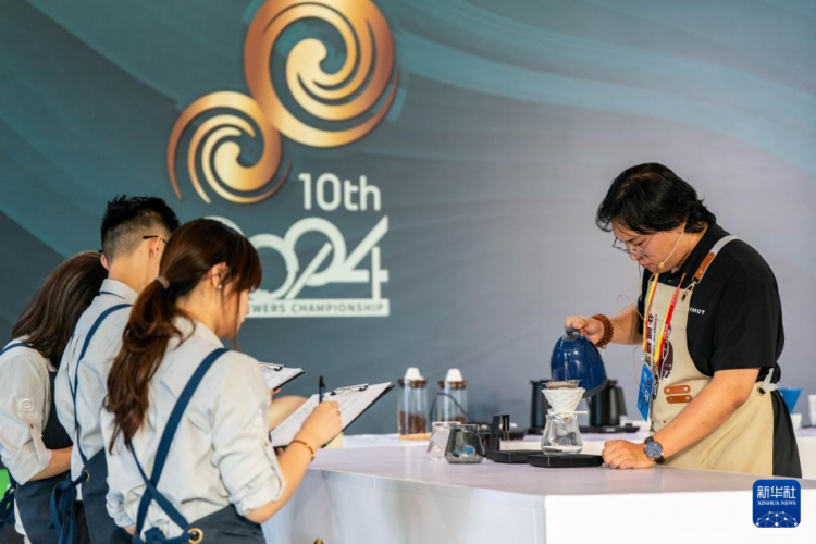 7月24日,在第八届南博会咖啡产业馆,一名选手在咖啡冲煮大赛上冲泡咖啡。