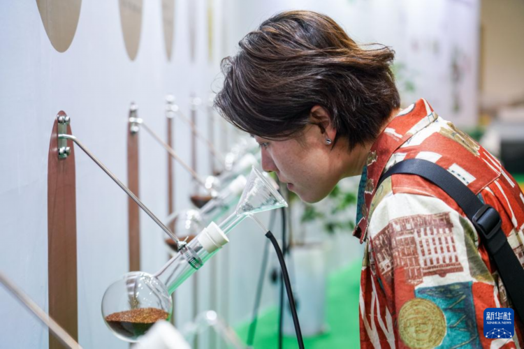 7月24日,参观者在咖啡产业馆里感受咖啡的香气。