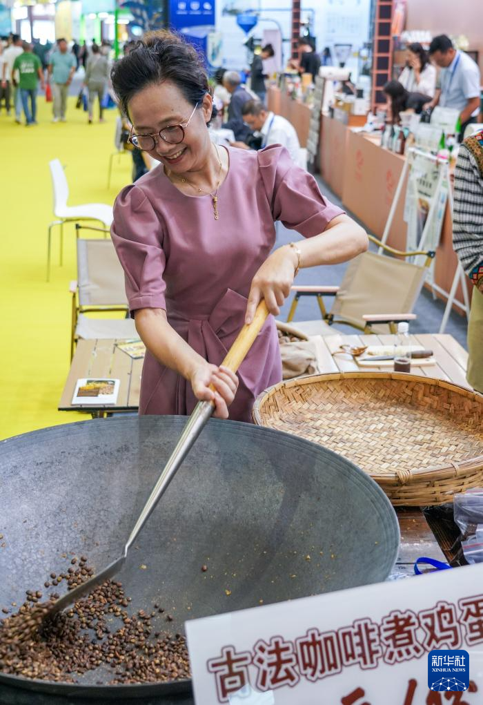 7月24日,参观者在咖啡产业馆里体验炒咖啡豆。