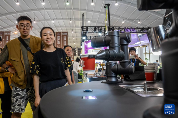7月24日,在第八届南博会咖啡产业馆,观众在观看咖啡机器人制作咖啡。
