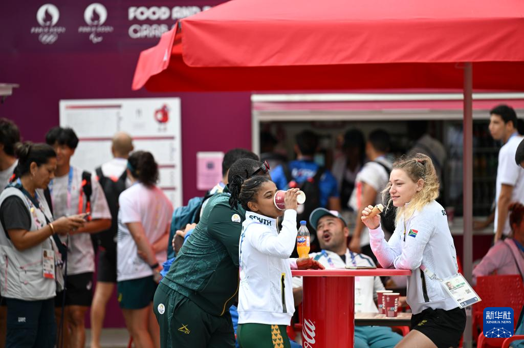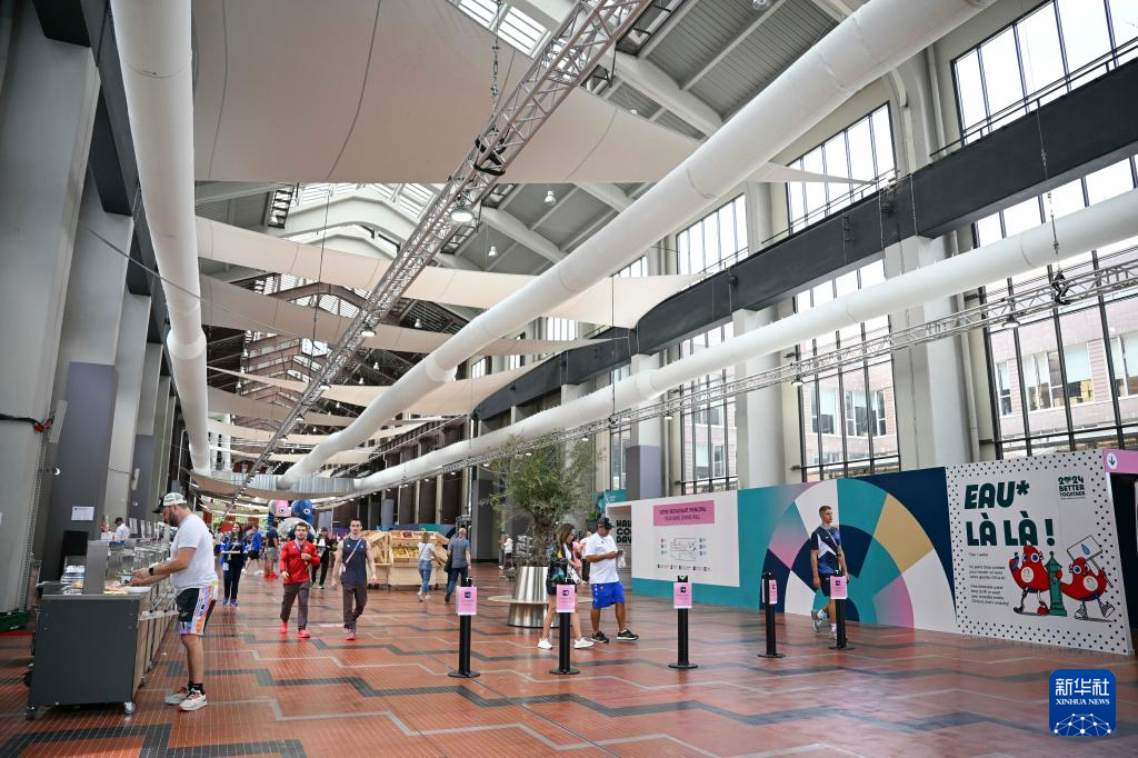7月23日,来自不同代表团的运动员、工作人员在巴黎奥运村内休闲、交流。 当日,巴黎奥运会组委会邀请媒体记者探访巴黎奥运村。巴黎奥运村占地约52公顷,位于小巴黎北部近郊,共建成了82栋建筑,约3000套公寓。奥运会期间,这里将接待超过14000名运动员及工作人员,残奥会期间将接待约9000人。 新华社记者 胡虎虎 摄