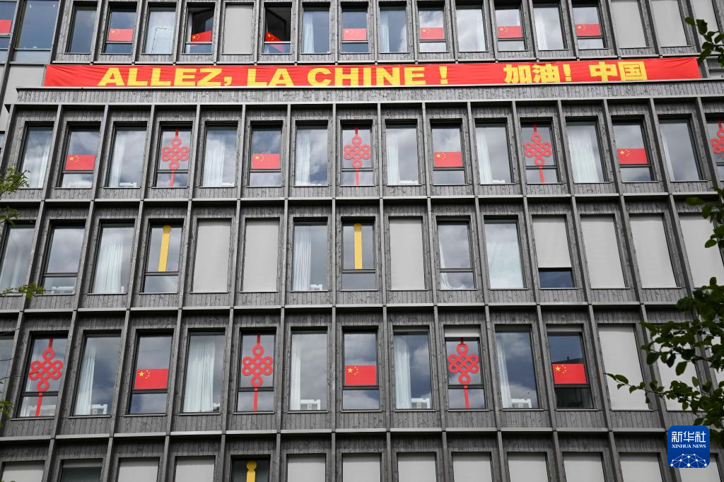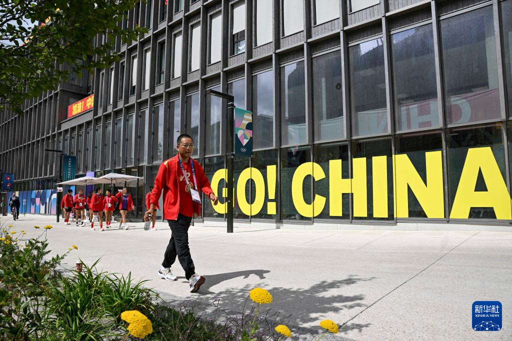 这是7月23日拍摄的巴黎奥运村内中国体育代表团成员居住的公寓。 当日,巴黎奥运会组委会邀请媒体记者探访巴黎奥运村。巴黎奥运村占地约52公顷,位于小巴黎北部近郊,共建成了82栋建筑,约3000套公寓。奥运会期间,这里将接待超过14000名运动员及工作人员,残奥会期间将接待约9000人。 新华社记者 胡虎虎 摄