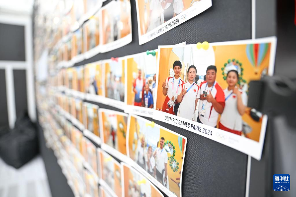 这是7月23日在巴黎奥运村内“运动员365小屋”拍摄的中国体育代表团成员合影。 当日,巴黎奥运会组委会邀请媒体记者探访巴黎奥运村。巴黎奥运村占地约52公顷,位于小巴黎北部近郊,共建成了82栋建筑,约3000套公寓。奥运会期间,这里将接待超过14000名运动员及工作人员,残奥会期间将接待约9000人。 新华社记者 胡虎虎 摄