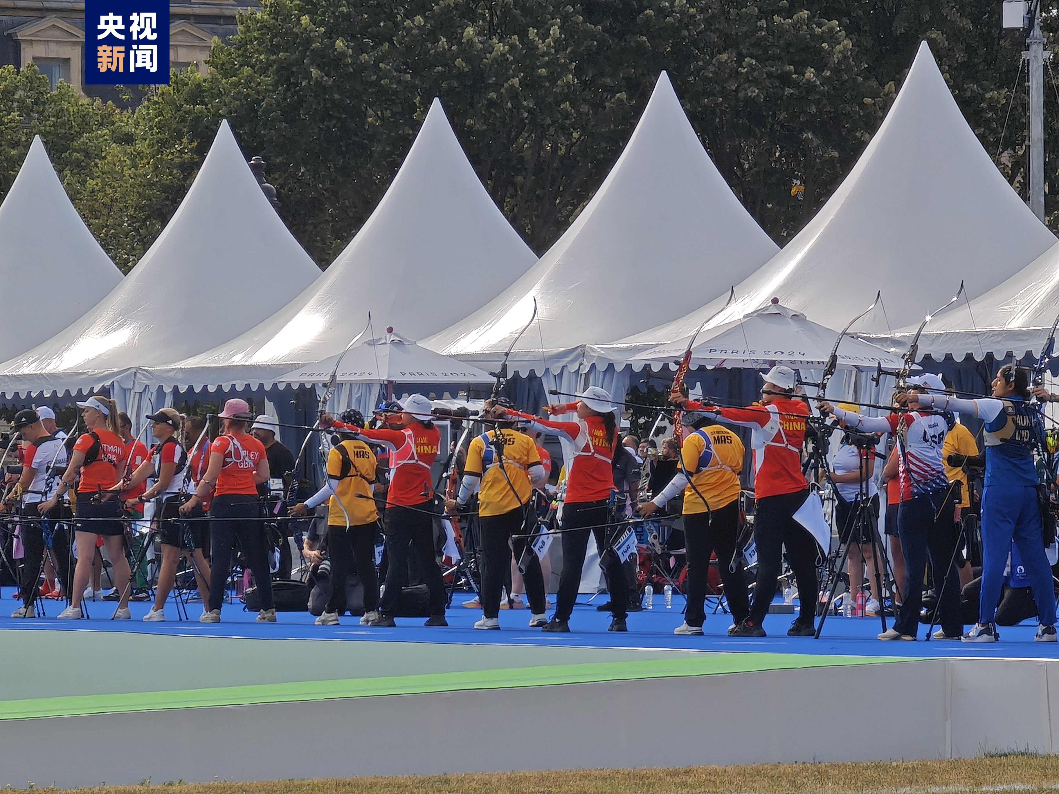 7月25日,在巴黎奥运会射箭女子个人排名赛中,中国队选手李佳蔓、安琦轩、杨晓蕾出场,这是中国代表团选手首次亮相巴黎奥运赛场!