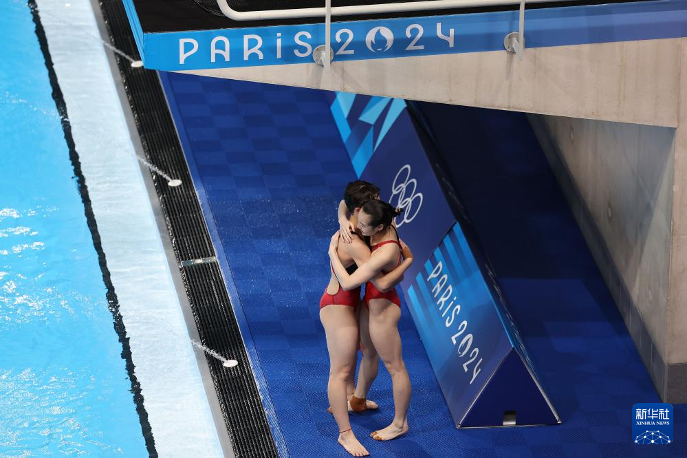 7月27日,中国选手昌雅妮(右)/陈艺文拥抱庆祝。新华社记者 李颖 摄