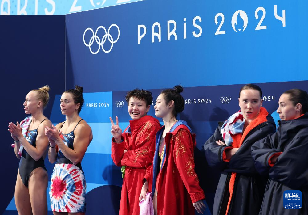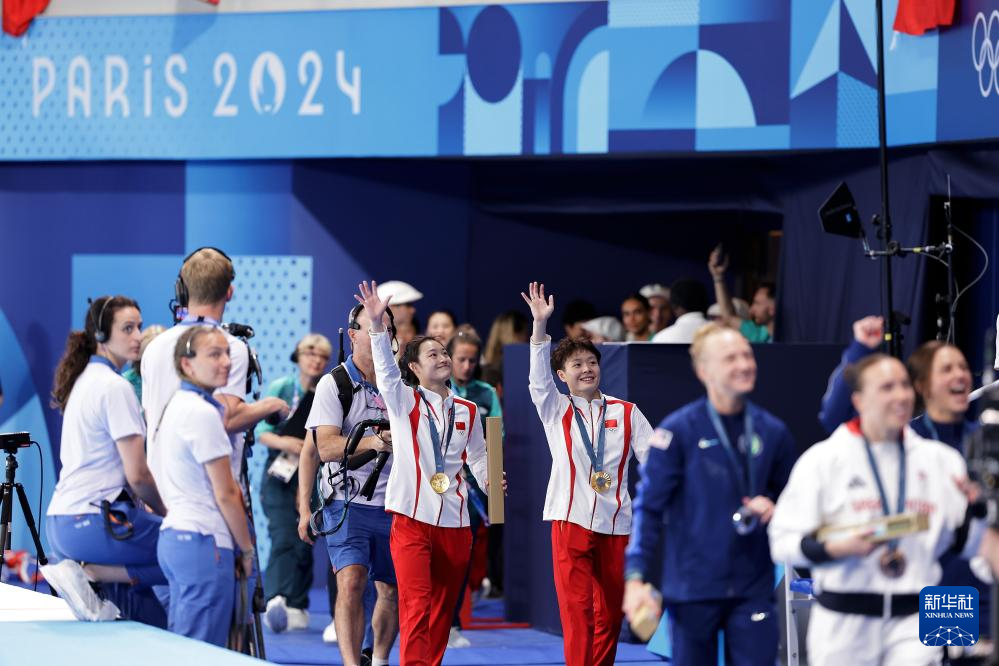 7月27日,中国选手昌雅妮(中左)/陈艺文(中右)向观众挥手致意。新华社记者 张玉薇 摄
