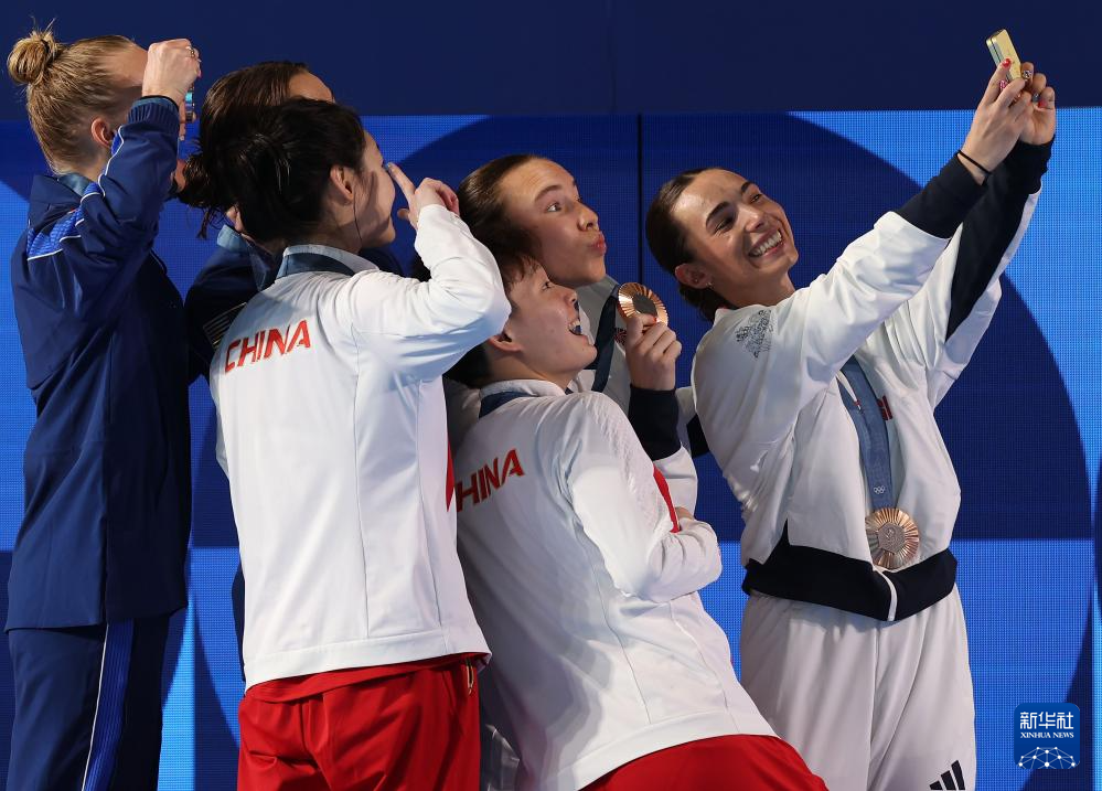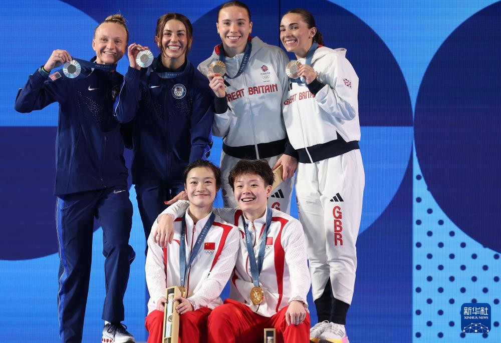 7月27日,冠军中国选手昌雅妮(左四)/陈艺文(左三)、亚军美国选手培根(左一)/库克(左二)、季军英国选手哈珀(右二)/米尤-詹森(右一)展示奖牌。新华社记者 李颖 摄