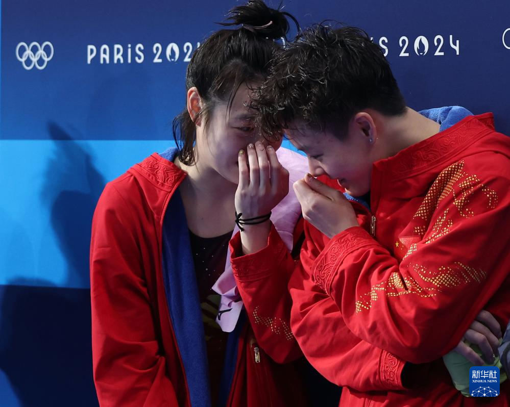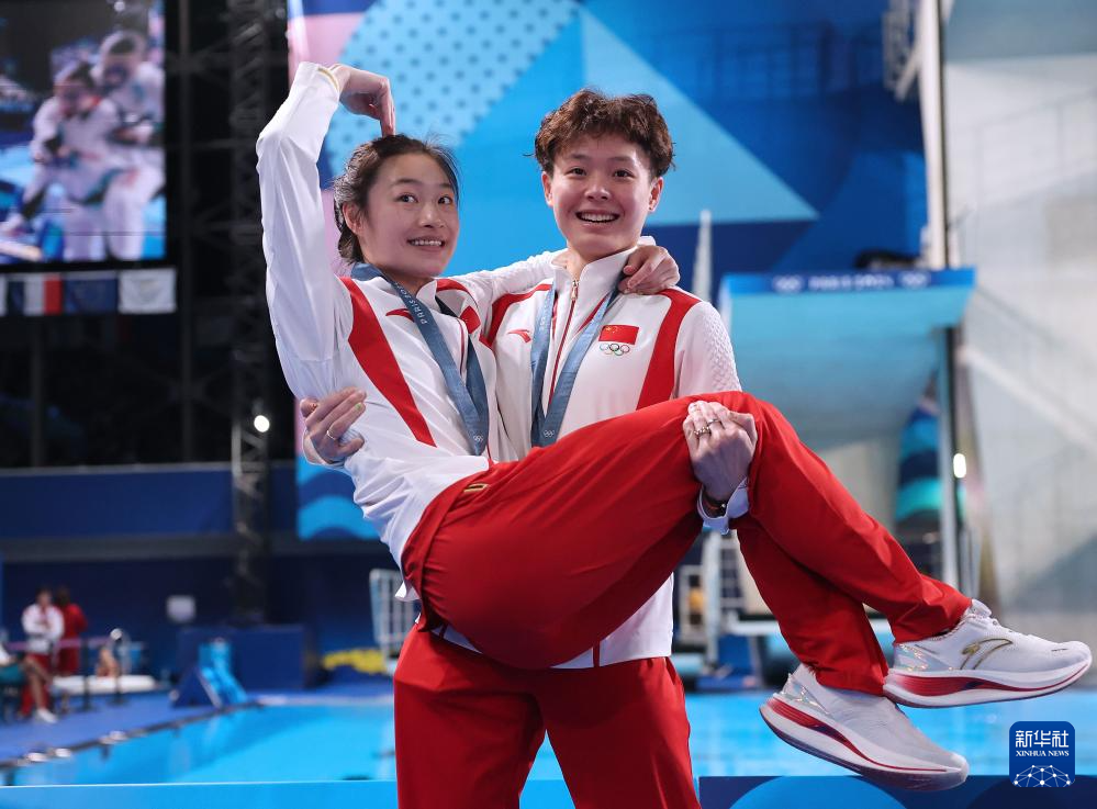 7月27日,中国选手昌雅妮(右)/陈艺文相拥庆祝。新华社记者 李明 摄
