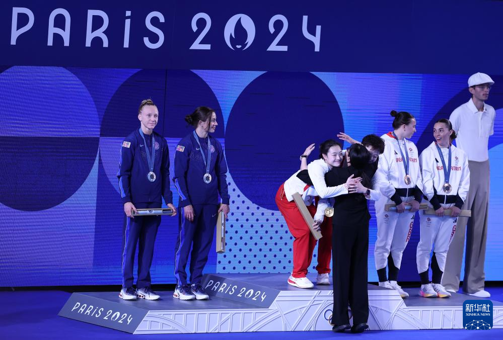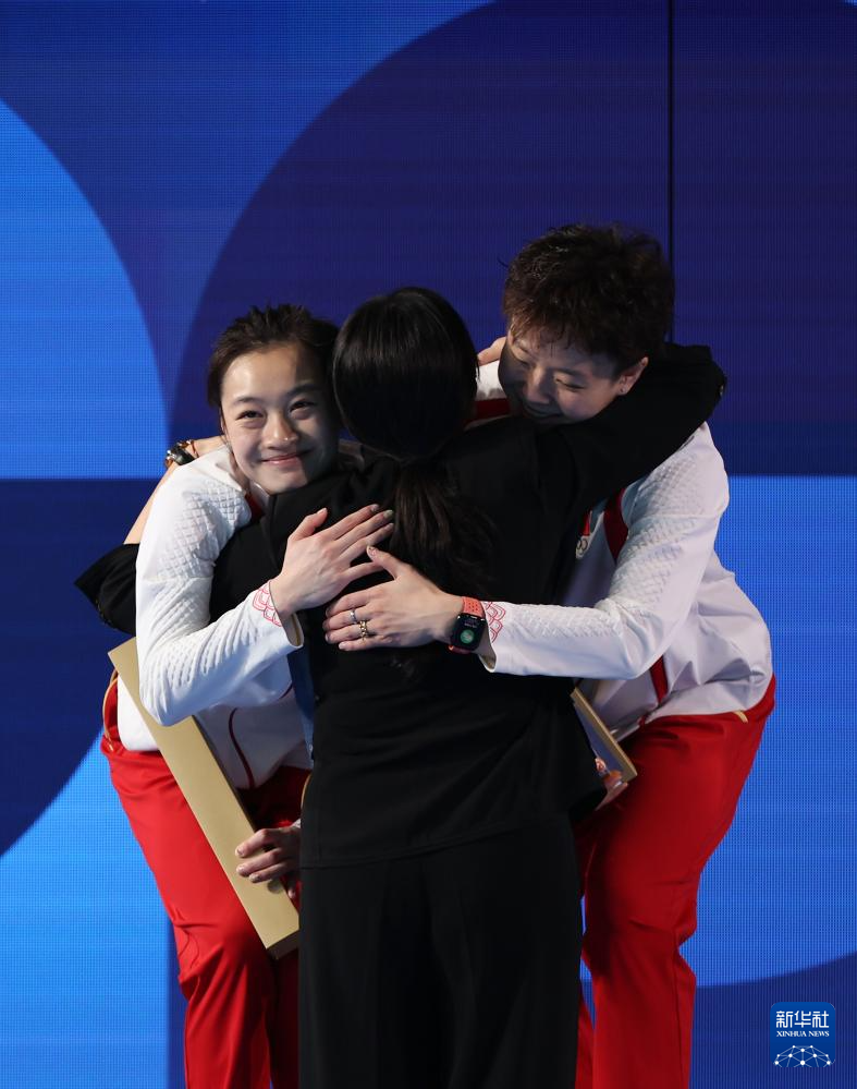 7月27日,中国选手昌雅妮(左一)/陈艺文(左三)在比赛中和参赛选手拥抱。新华社记者 李颖 摄