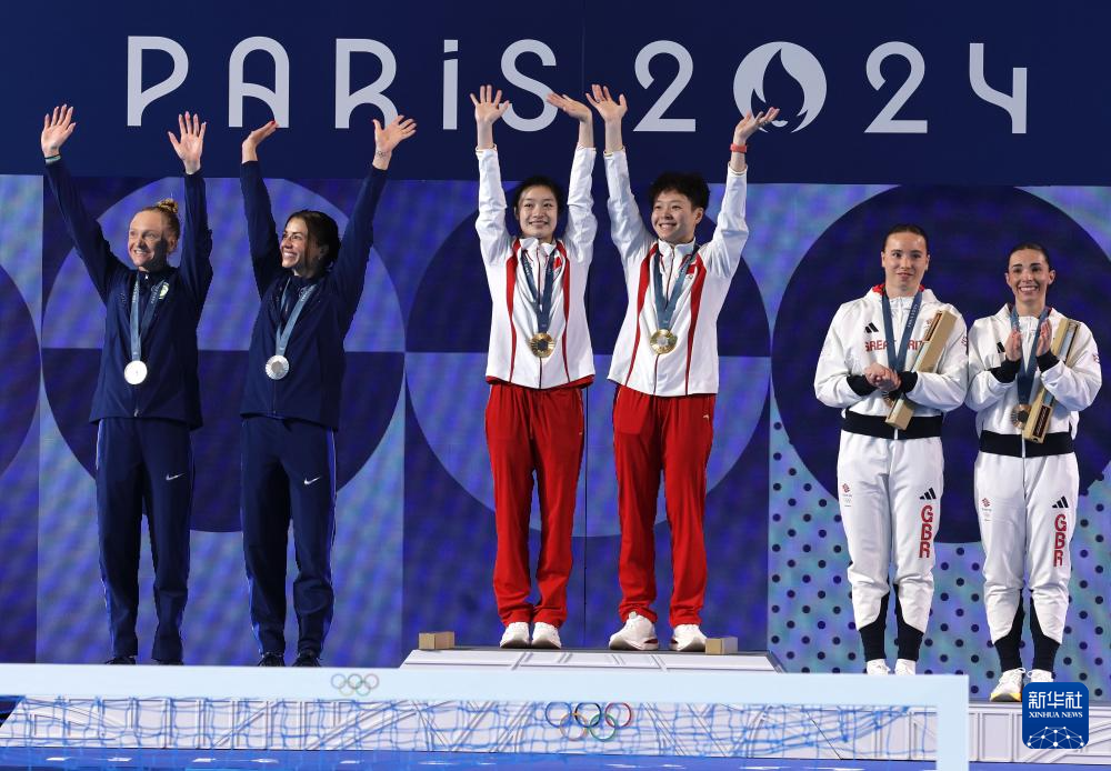 7月27日,冠军中国选手昌雅妮(前左)/陈艺文(前右)、亚军美国选手培根(后左一)/库克(后左二)、季军英国选手哈珀(后右二)/米尤-詹森(后右一)出席颁奖仪式。新华社记者 李颖 摄