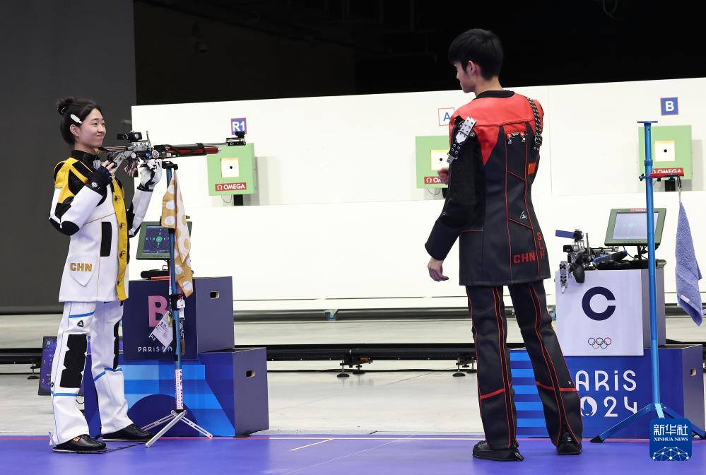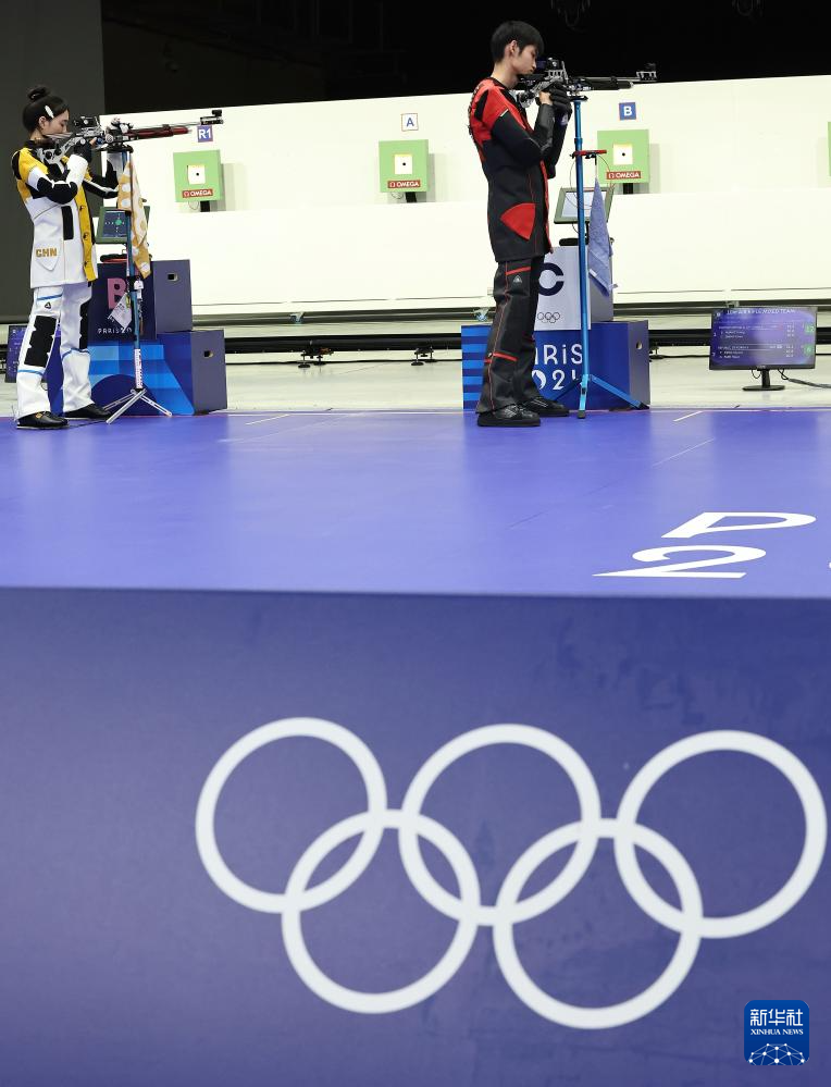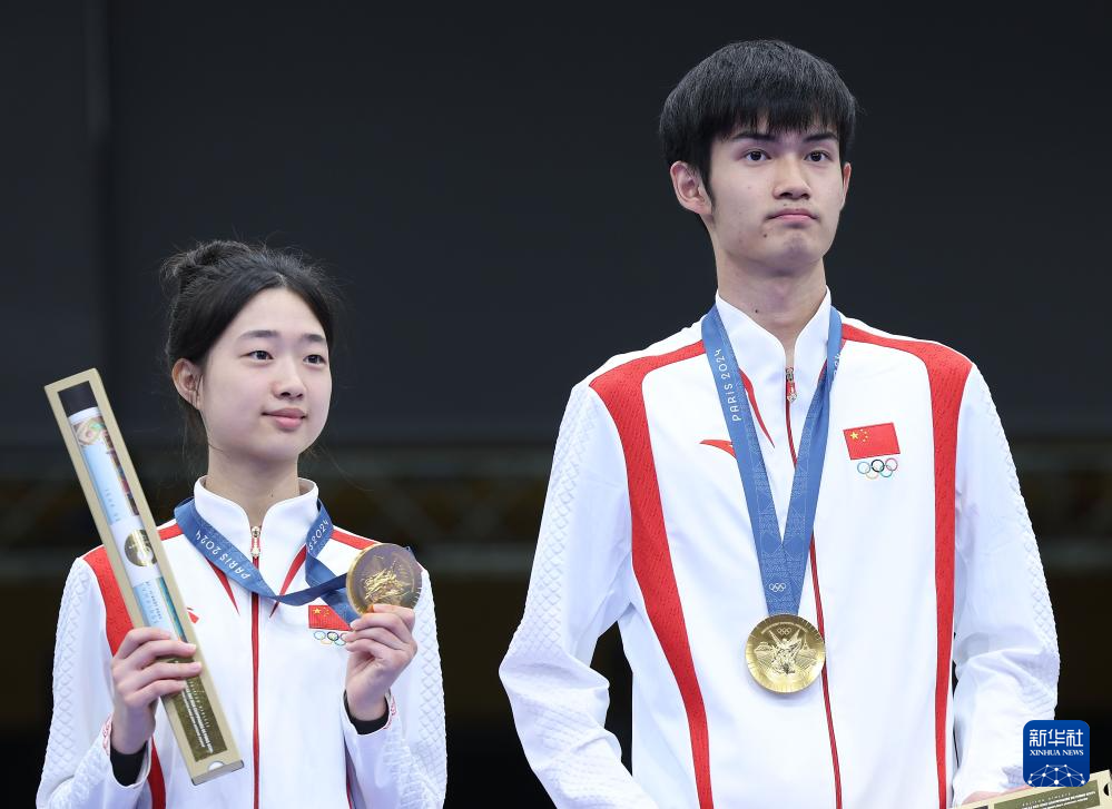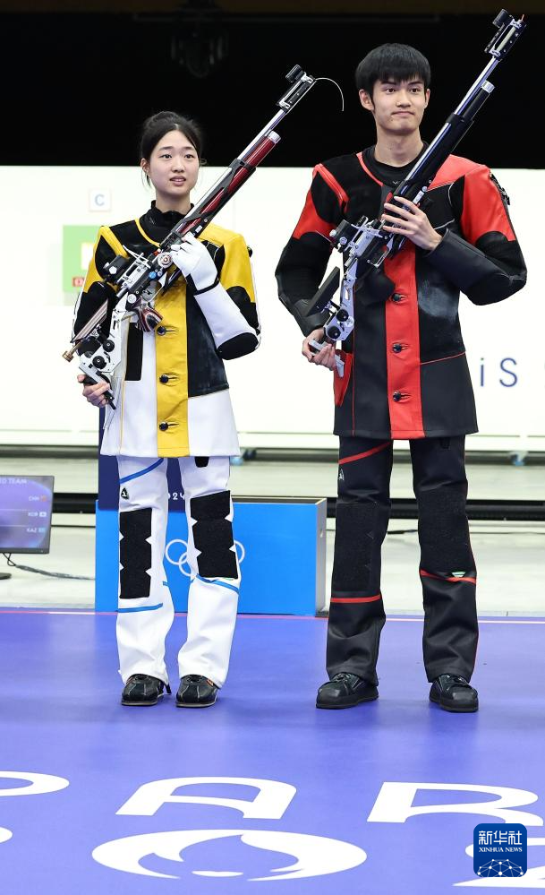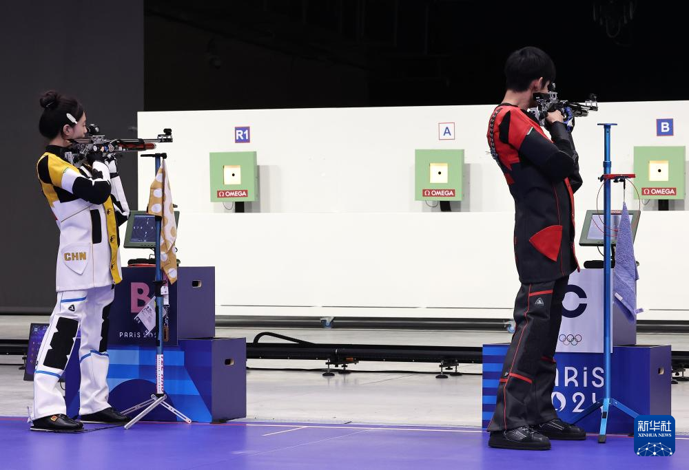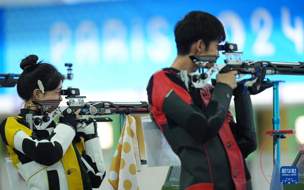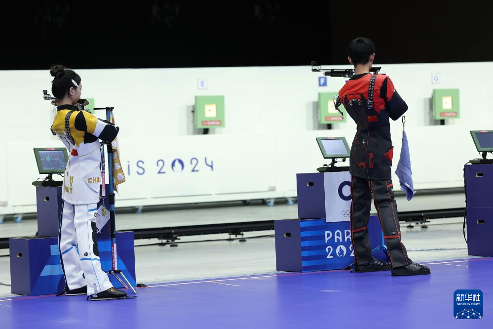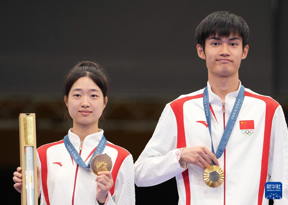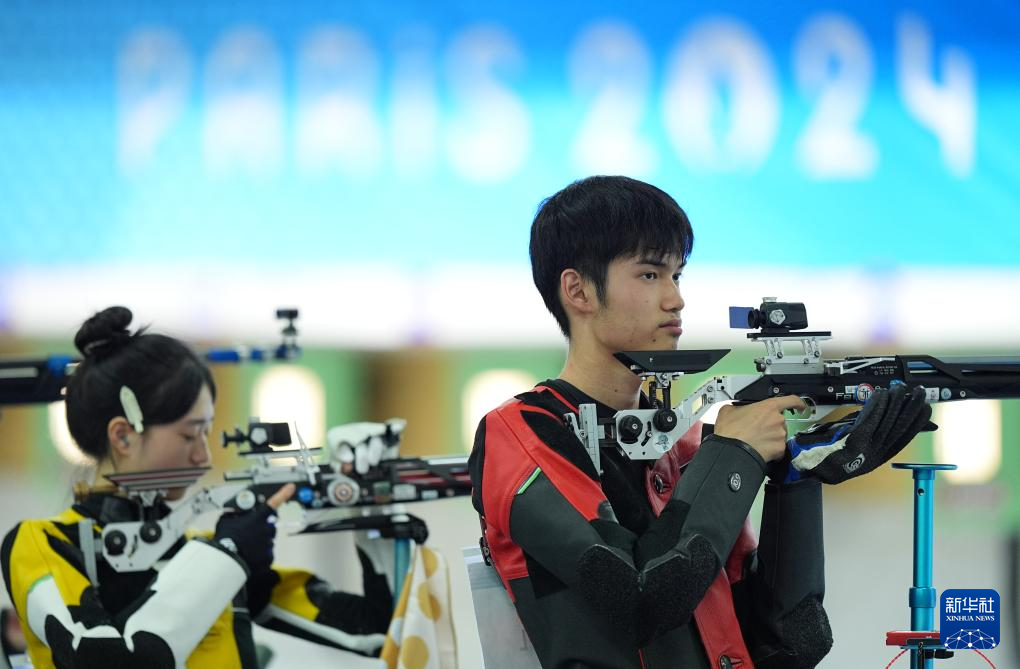 当日,在法国沙托鲁举行的巴黎奥运会射击10米气步枪混合团体决赛中,中国选手黄雨婷/盛李豪夺冠,赢得巴黎奥运会首枚金牌。