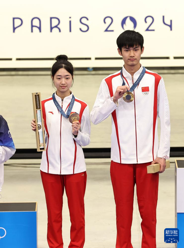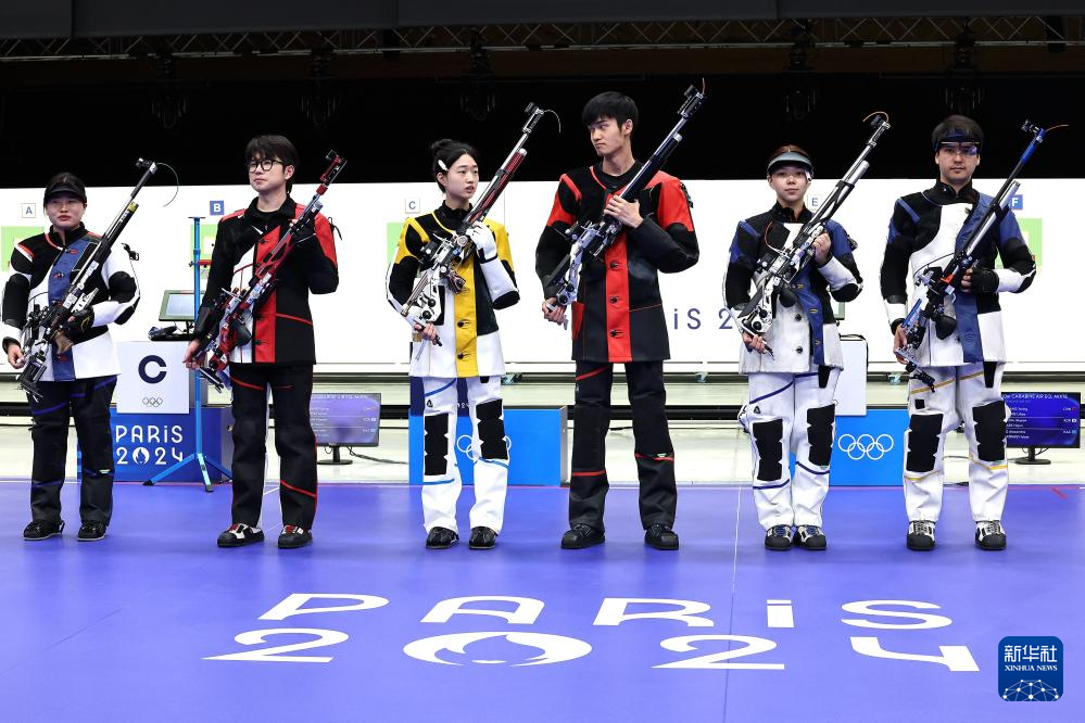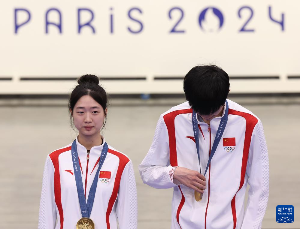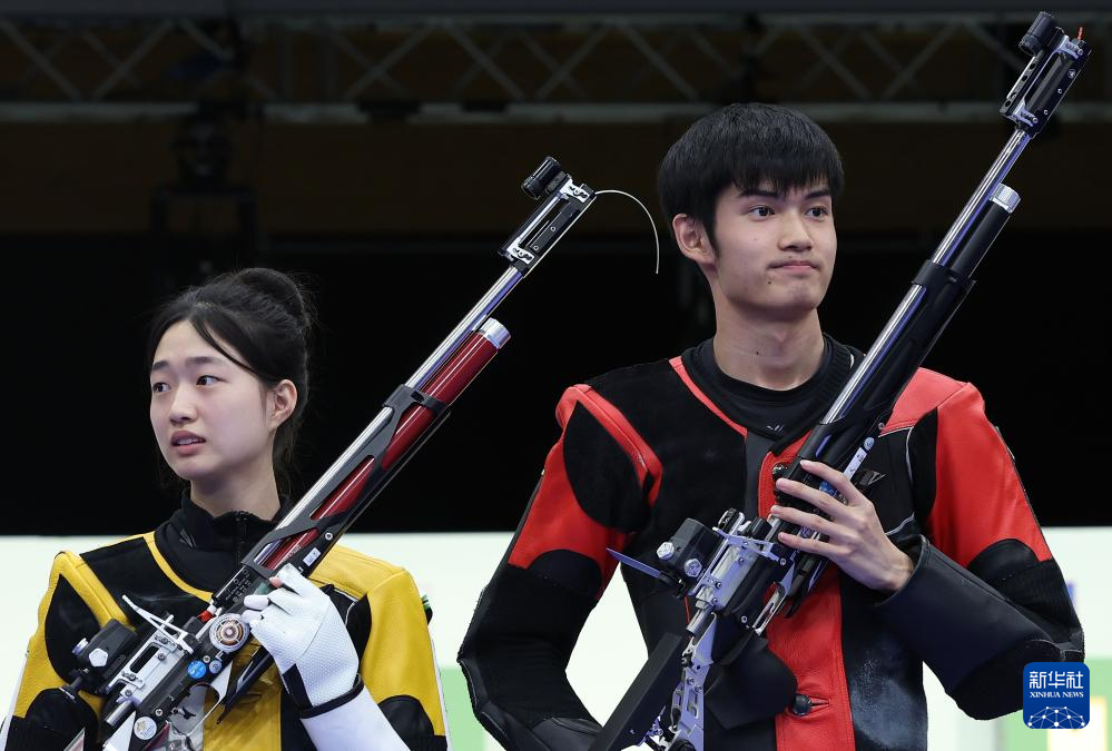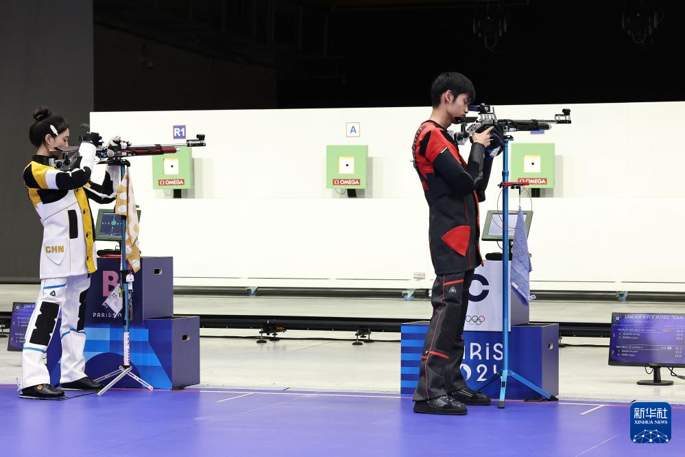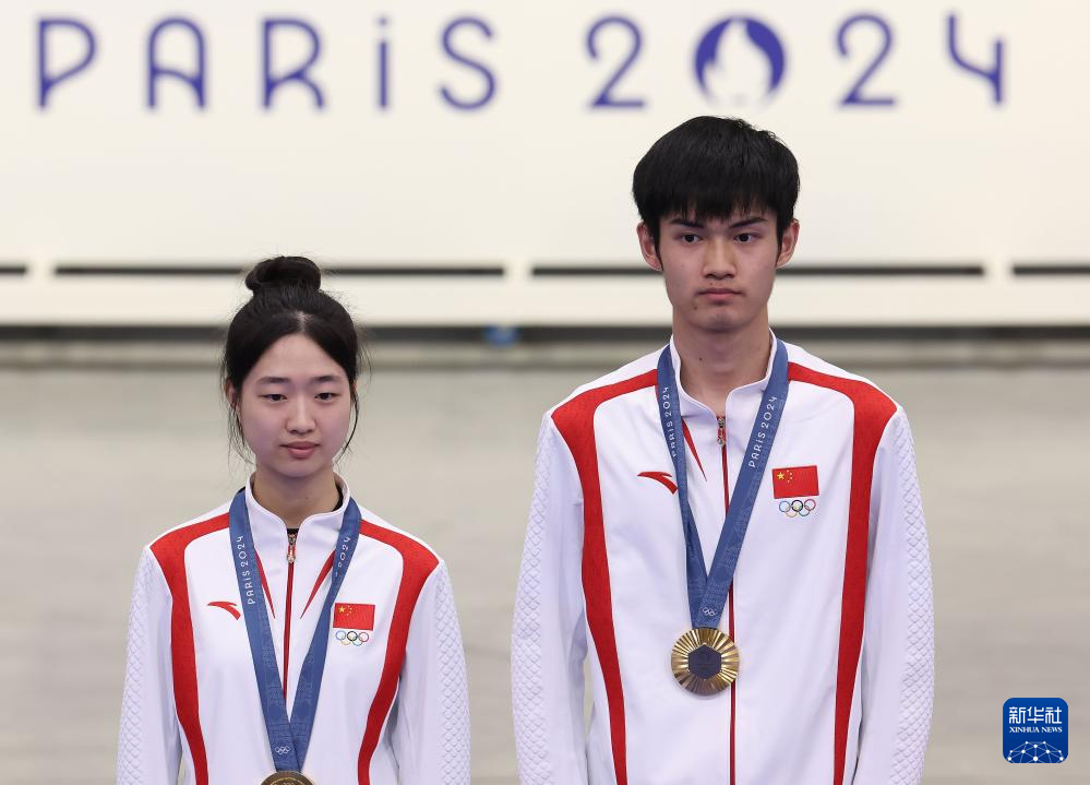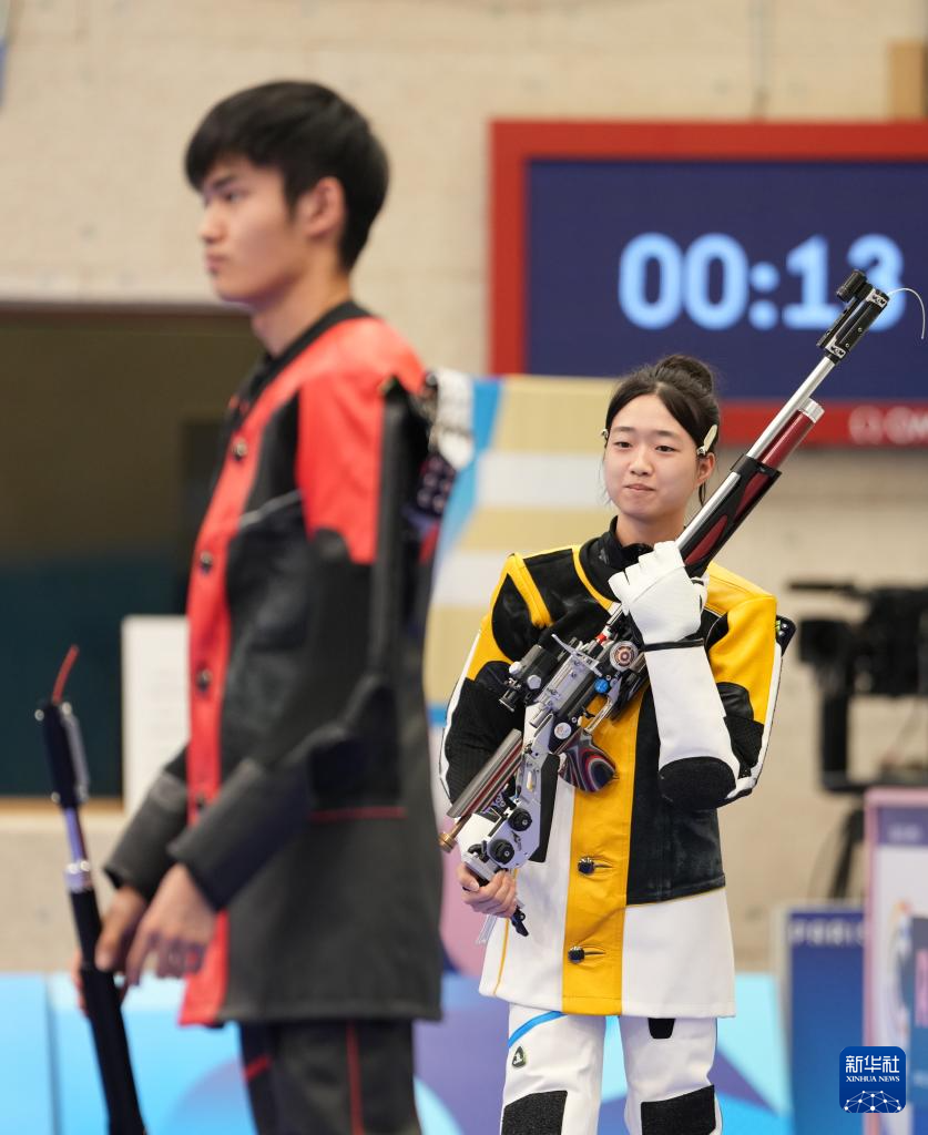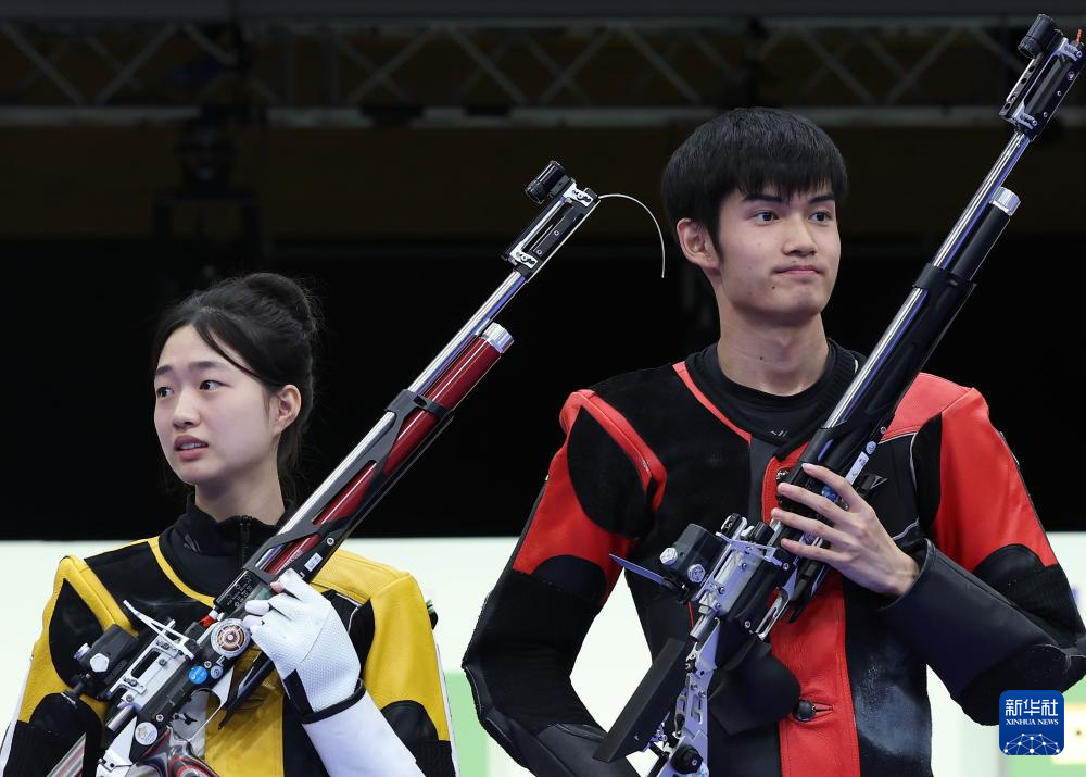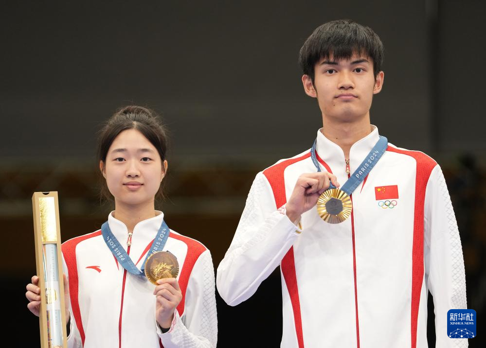 当日,在法国沙托鲁举行的巴黎奥运会射击10米气步枪混合团体决赛中,中国选手黄雨婷/盛李豪夺冠,赢得巴黎奥运会首枚金牌。