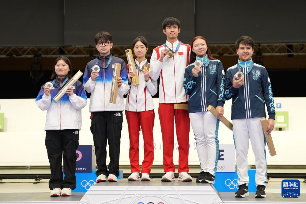 7月27日,冠军中国选手黄雨婷(左三)/盛李豪(右三)、亚军韩国选手金智贤(左一)/朴是晙(左二)与季军哈萨克斯坦选手亚历山德拉·蕾(右二)/伊斯兰·萨特帕耶夫在颁奖仪式上。新华社记者 鞠焕宗 摄