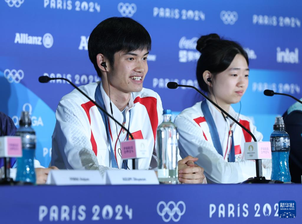7月27日,冠军中国选手黄雨婷/盛李豪(左)在赛后新闻发布会上。新华社记者 赵丁喆 摄