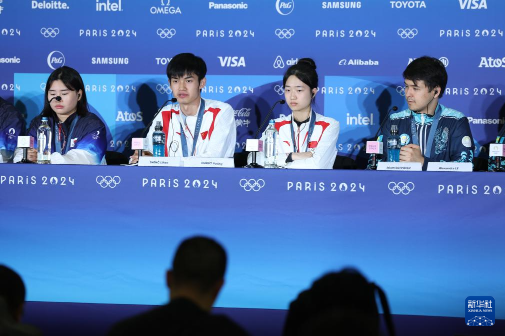 7月27日,冠军中国选手黄雨婷(右二)/盛李豪(左二)在赛后新闻发布会上。新华社记者 赵丁喆 摄