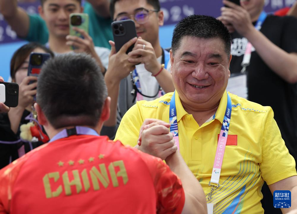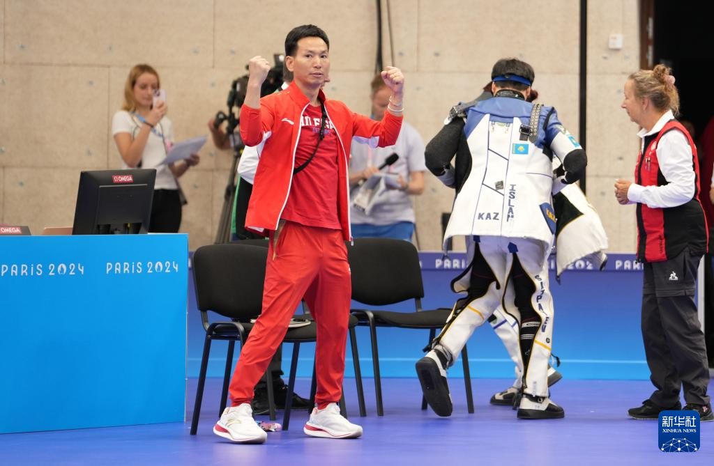 7月27日,国际射联副主席、中国射击奥运冠军王义夫(右)在比赛后庆祝。新华社记者 赵丁喆 摄
