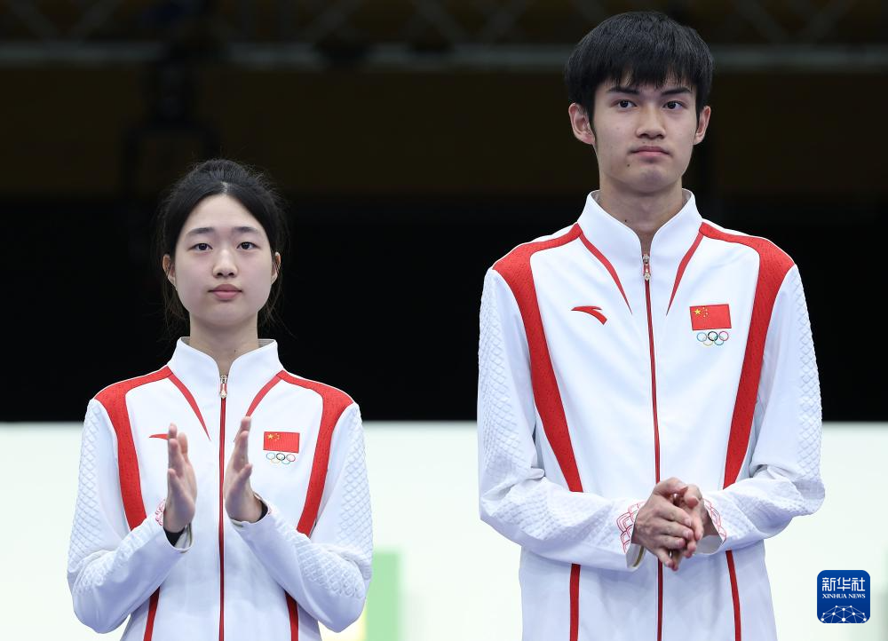 7月27日,冠军中国选手黄雨婷/盛李豪(右)在颁奖仪式上。新华社记者 张帆 摄