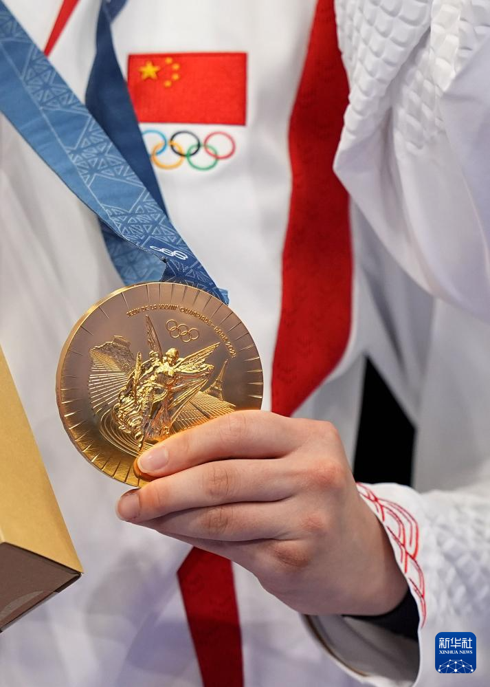7月27日,中国选手黄雨婷在颁奖仪式上展示金牌。新华社记者 鞠焕宗 摄