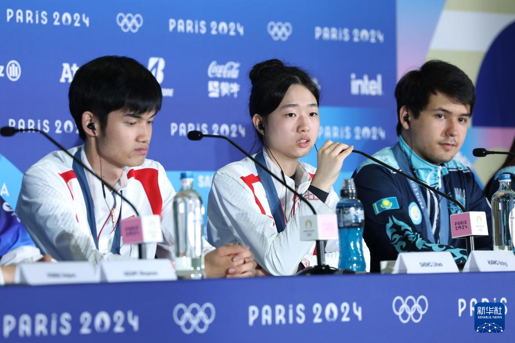 7月27日,冠军中国选手黄雨婷(中)/盛李豪(左)在赛后新闻发布会上。新华社记者 赵丁喆 摄