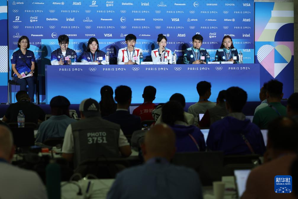 这是7月27日拍摄的赛后新闻发布会现场。新华社记者 赵丁喆 摄