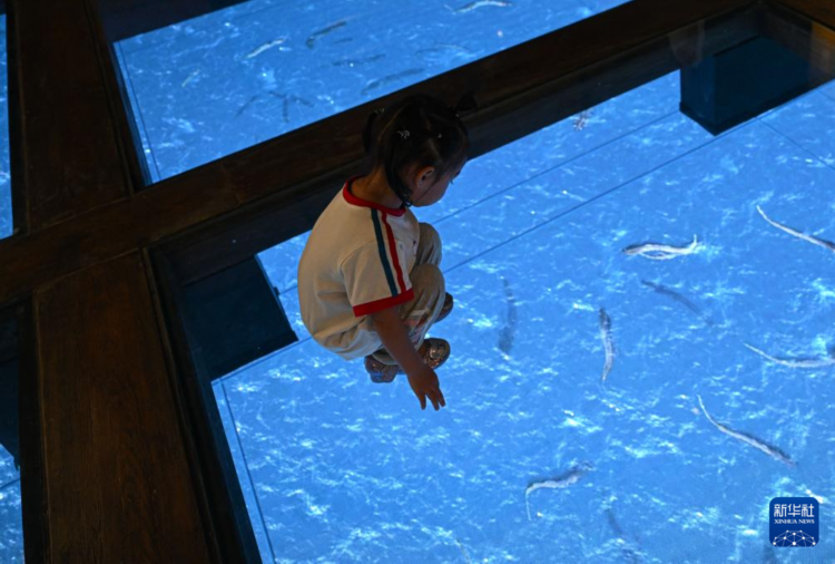 7月26日,游客在海南疍家博物馆模拟的疍家渔排上观看展现渔排底部水产养殖的动画。