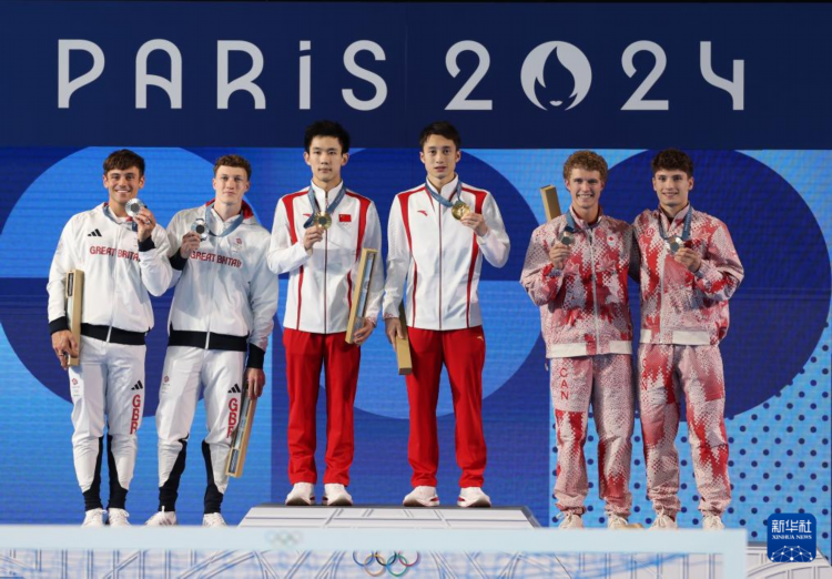 7月29日,冠军中国选手练俊杰(左四)/杨昊(左三)、亚军英国选手戴利(左一)/威廉姆斯(左二)、季军加拿大选手维恩斯(右二)/容博尔-穆雷(右一)在颁奖仪式上。新华社记者 李颖 摄