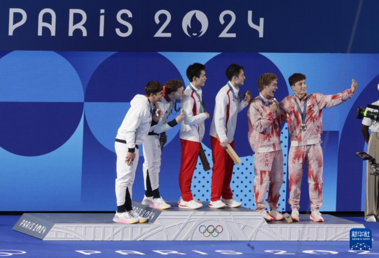 7月29日,冠军中国选手练俊杰(左四)/杨昊(左三)、亚军英国选手戴利(左一)/威廉姆斯(左二)、季军加拿大选手维恩斯(右二)/容博尔-穆雷(右一)在颁奖仪式上自拍。新华社记者 张玉薇 摄