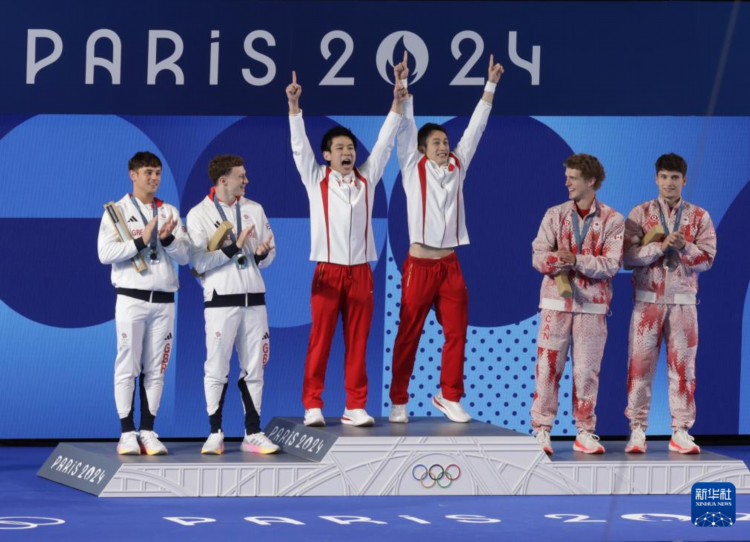 7月29日,冠军中国选手练俊杰(左四)/杨昊(左三)登上领奖台。新华社记者 张玉薇 摄