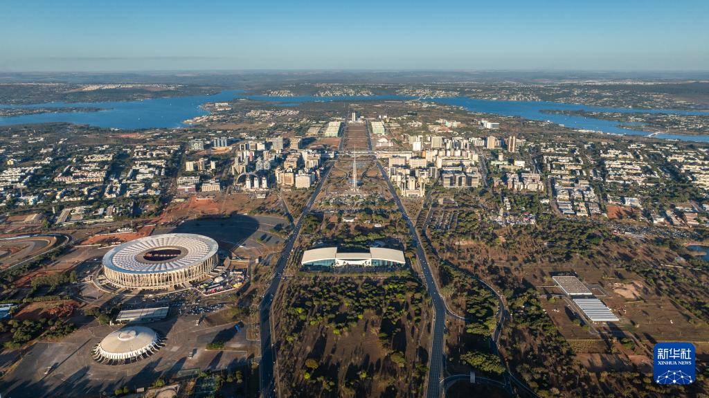 这是2024年7月14日在巴西首都巴西利亚拍摄的城市中轴线和周围部分区域景观(无人机照片)。 巴西利亚以其城市规划及城市建筑闻名世界。1956年,时任巴西总统儒塞利诺·库比契克决定迁都内陆。在不到4年的时间里,巴西高原之上便建起了一座别具一格的现代化城市。1960年4月21日,巴西正式迁都巴西利亚。巴西利亚于1987年被联合国教科文组织(UNESCO)列入世界文化遗产名录。 新华社记者 王天聪 摄