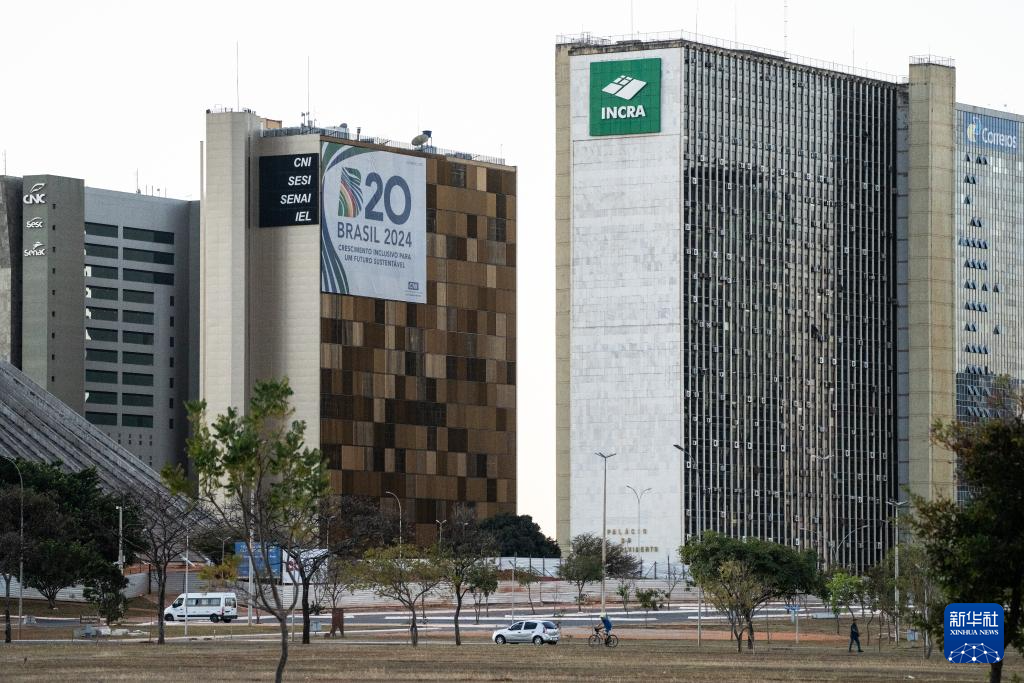 这是2024年7月14日在巴西首都巴西利亚拍摄的一座悬挂有“G20”标志性的建筑。 巴西利亚以其城市规划及城市建筑闻名世界。1956年,时任巴西总统儒塞利诺·库比契克决定迁都内陆。在不到4年的时间里,巴西高原之上便建起了一座别具一格的现代化城市。1960年4月21日,巴西正式迁都巴西利亚。巴西利亚于1987年被联合国教科文组织(UNESCO)列入世界文化遗产名录。 新华社记者 王天聪 摄