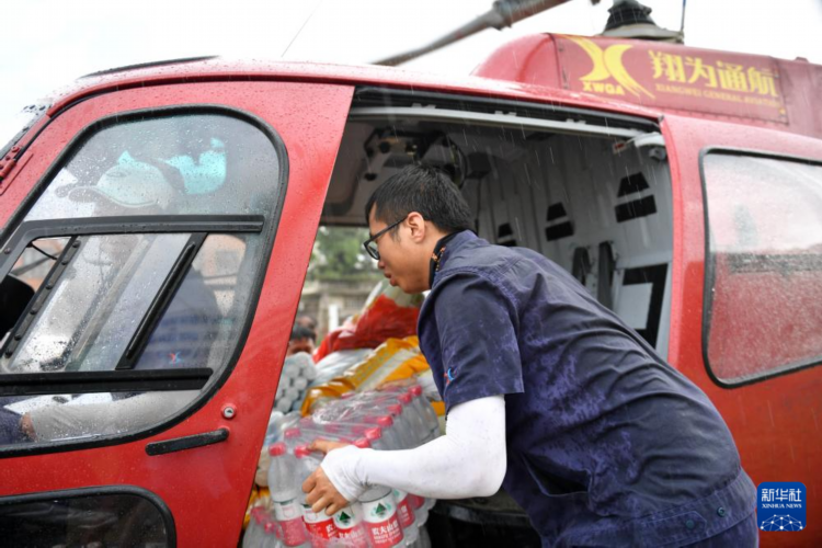 7月29日,在资兴市第一中学,工作人员将准备投放至受灾乡镇的生活物资搬运上直升机。