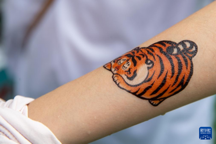 7月29日,在黑龙江东北虎林园,东北虎粉丝在手臂上贴上胖虎贴纸。
