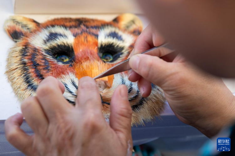 7月29日,在黑龙江东北虎林园,麦秸剪贴手艺人现场制作以“虎”为主题的作品。
