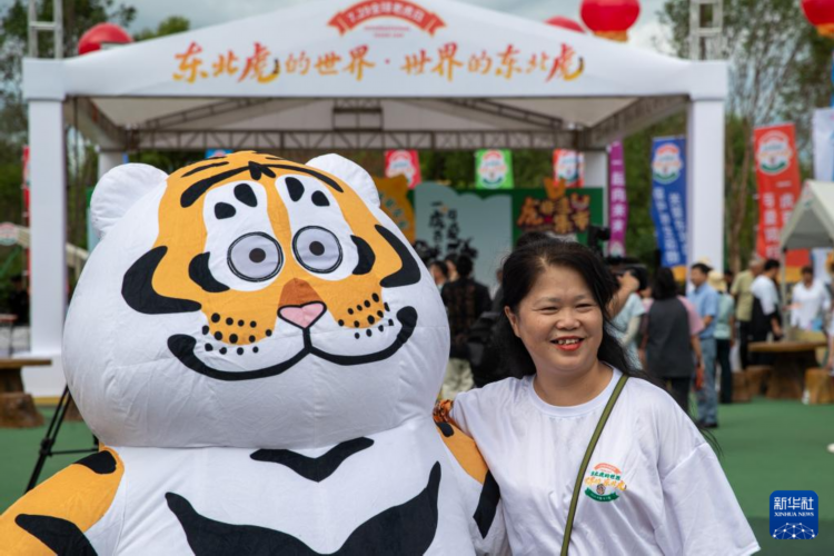 7月29日,在黑龙江东北虎林园,东北虎粉丝现场与胖虎吉祥物合影。