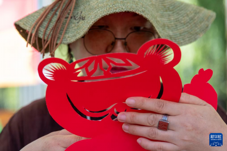 7月29日,在黑龙江东北虎林园,剪纸艺人现场制作以“虎”为主题的作品。