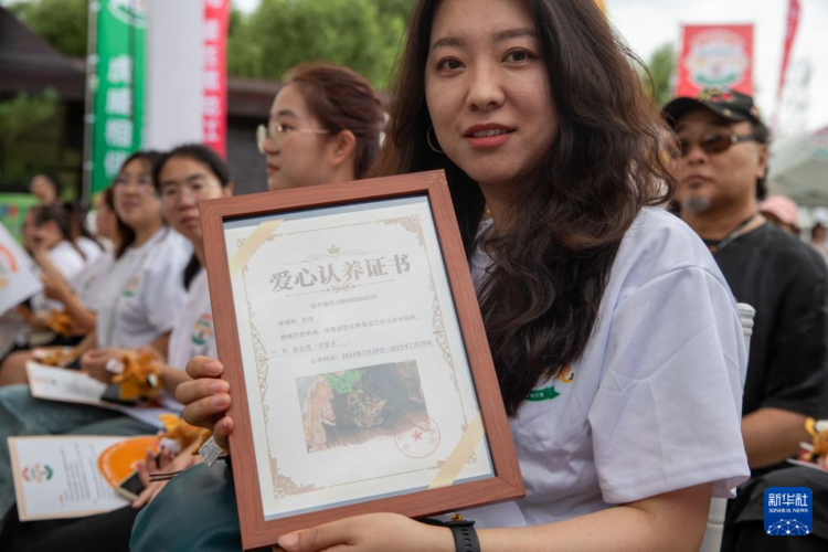 7月29日,在黑龙江东北虎林园,人们展示爱心认养证书。