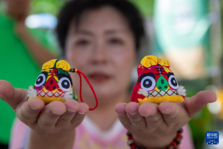 7月29日,在黑龙江东北虎林园,手艺人现场展示以“虎”为主题的手工布艺作品。