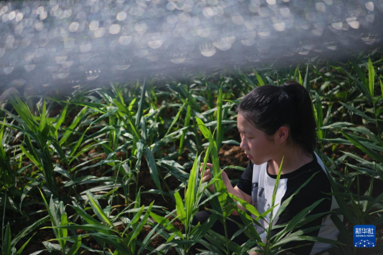 7月24日,在安徽省铜陵市义安区天门镇新华村,朱晴雨在自家白姜田里观察姜苗状态。新华社记者 张端 摄