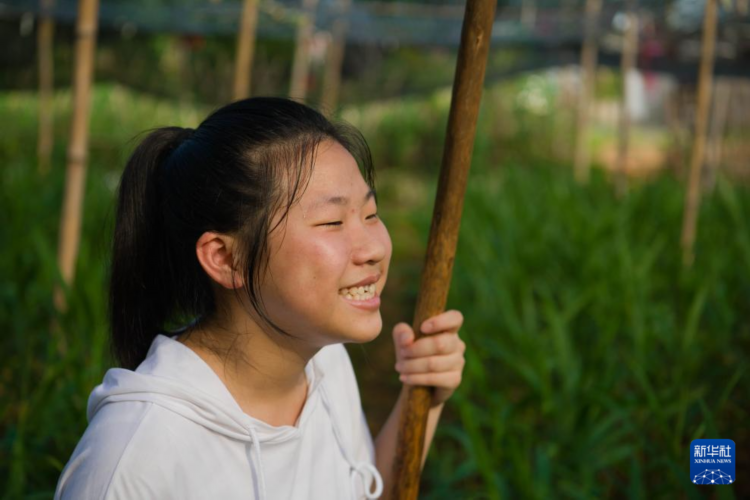 7月23日,在安徽省铜陵市义安区天门镇新华村,朱晴雨在自家白姜田里。新华社记者 张端 摄