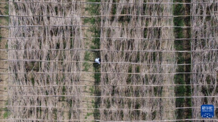 7月23日,在安徽省铜陵市义安区天门镇龙山村,朱晴雨在采用芭茅搭棚遮阴传统方法的白姜田里劳作(无人机照片)。新华社记者 傅天 摄