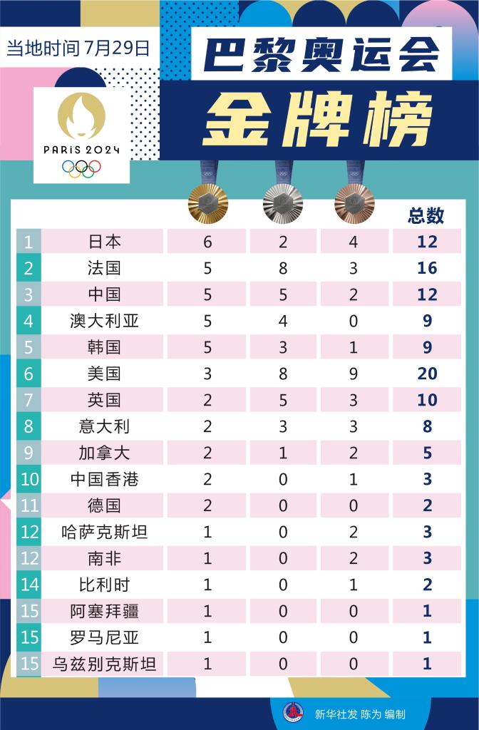 巴黎奥运会|7月29日巴黎奥运会金牌榜